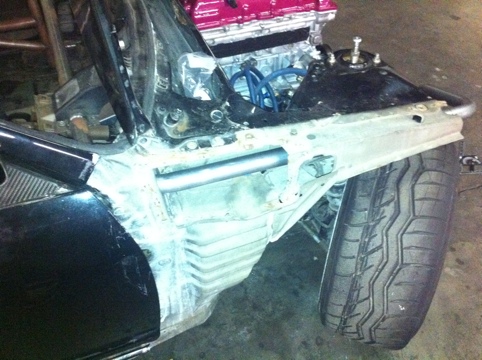 Lately been working on the front end of the Skyline. I want to tie all the front end into the cage so I have been cutting into the stock frame rail and drilling spot welds so I can gain access to running the front frame rail reinforcement all the way back and to the cage. So it works as a strut tower reinforcement as well. I am hoping if there is a front end impact all the strut tower bracing will help keep them where they are supposed to be.