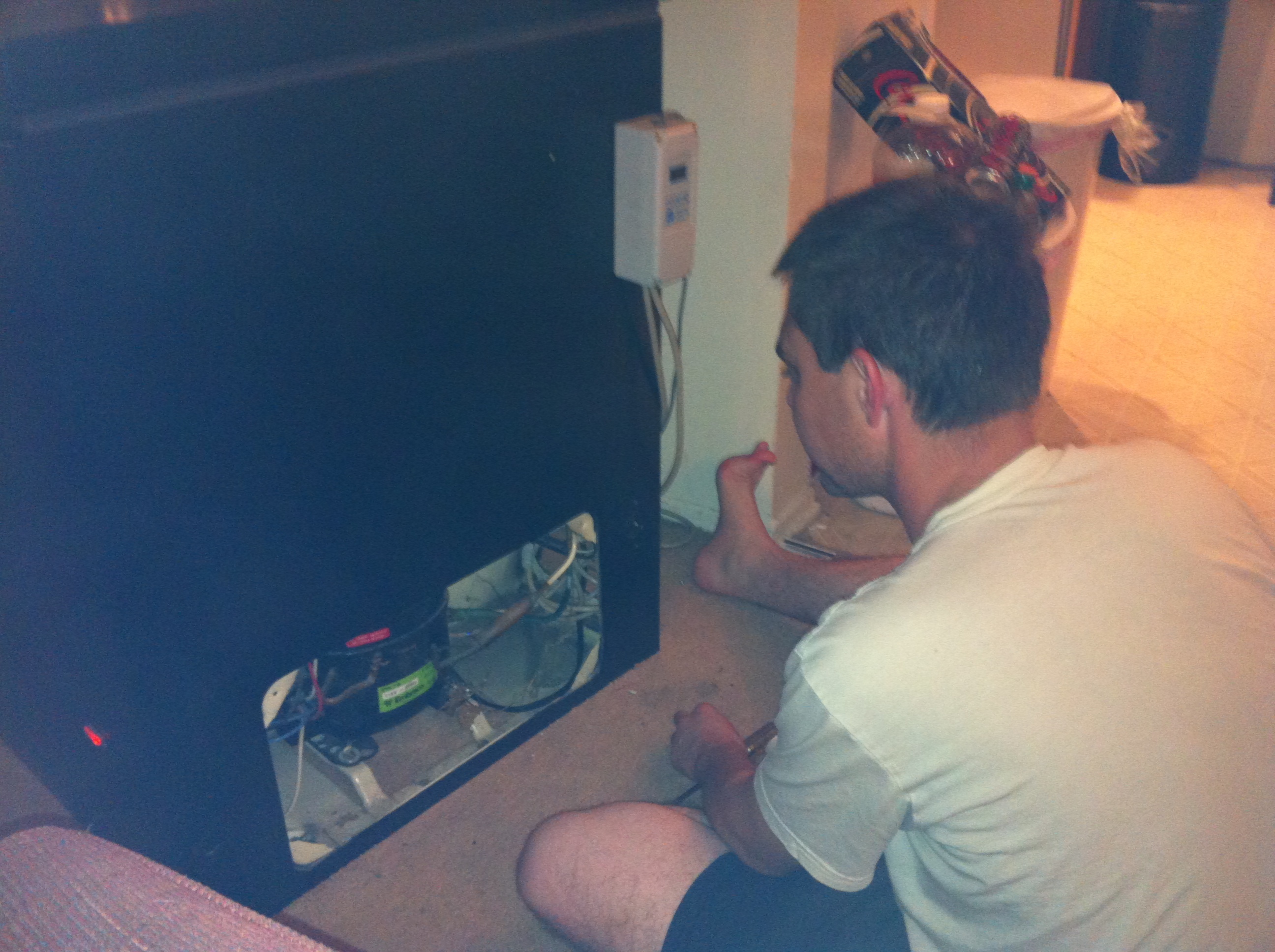 Tonight while we were watching Survivor we kept hearing the strangest noise. Then Bryan realized the ice was falling off the walls of the Kegerator because it was 35 degrees (not good for optimal beer stuff.) Bryan took off the access panel and started investigating. Eventually he was able to MacGyver something together and got it working again. Isn’t he neat?