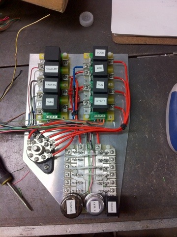Started on the new chassis harness today. I really hate stock harness they are usually over complicated and ugly. This car is a little more hassle since it will retain power locks, windows, and sunroof as well as DCC and a/c heater plus all of the required items. So I made up this little fuse panel/relay panel that fits in the passenger foot well so I can start wiring up the car. It uses a stock super multiple junction connector de-pinned of the extra wires I don’t need. This makes it super easy to remove the car as I can just unbolt all the wiring with one bolt. Here is what it looks like in progress and all finished up.